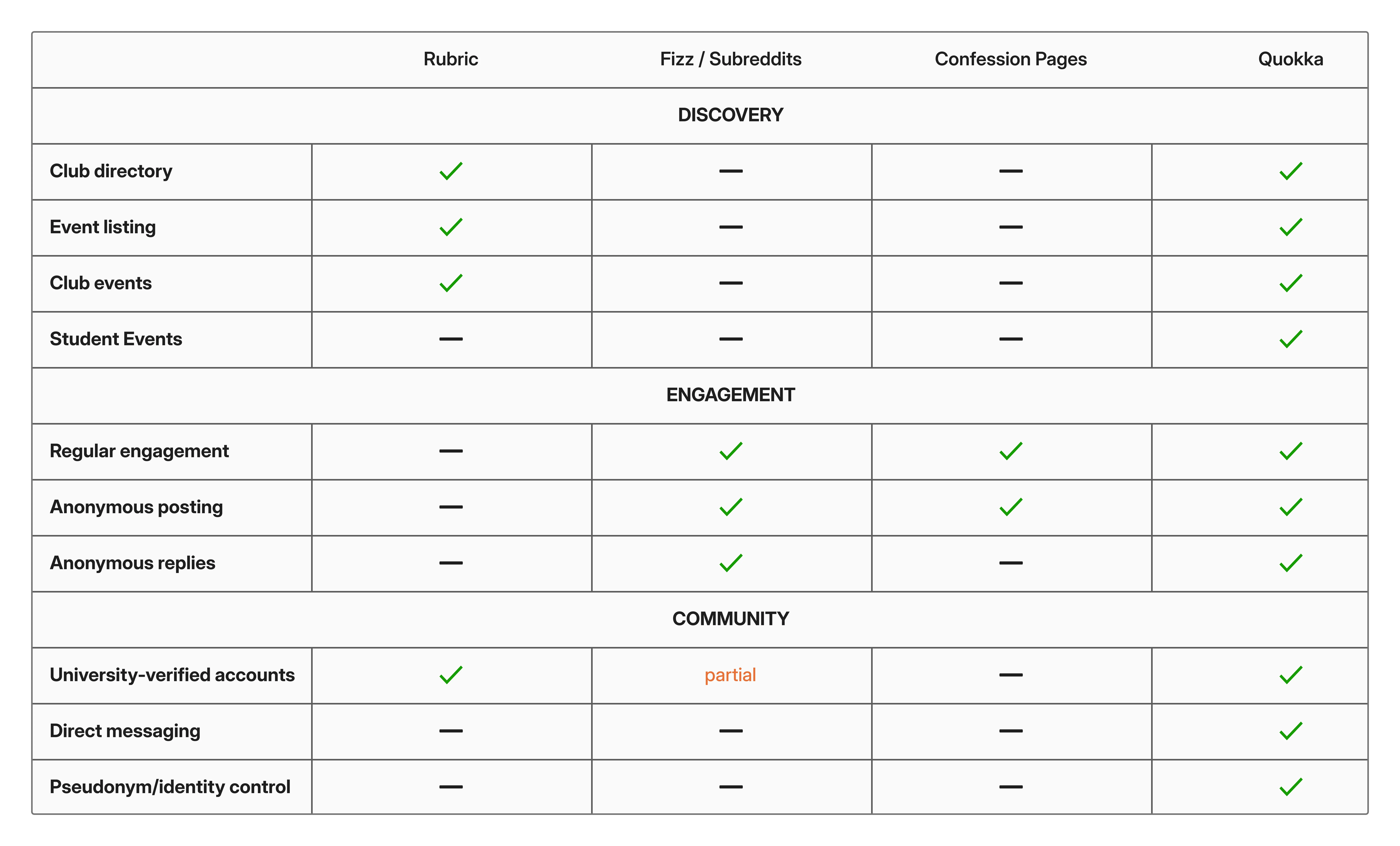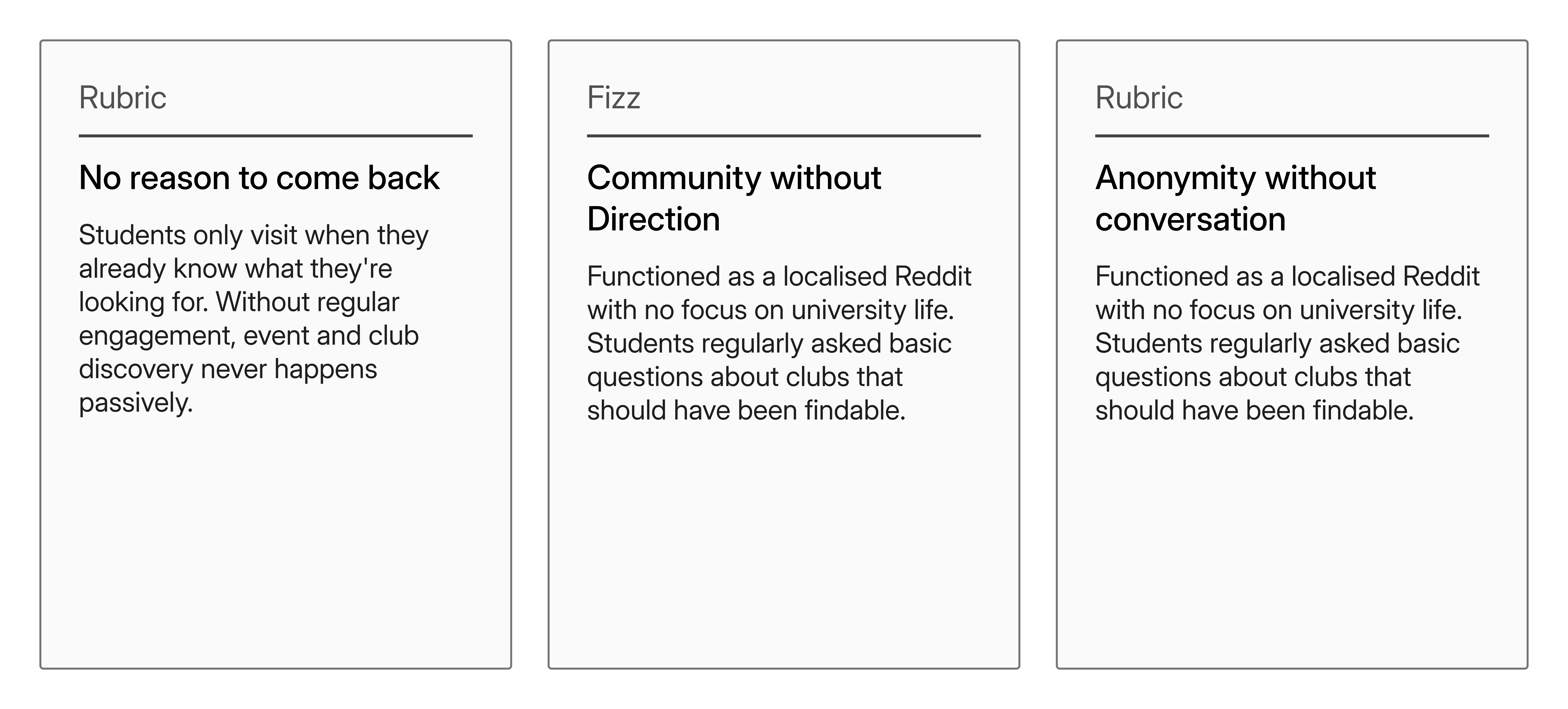 Alongside the survey, I found two distinct competitor types: event and club tools like Rubric, and anonymous forums like r/monash and university confession pages. I also had firsthand experience with Fizz during my US exchange. While using it to promote clubs, I kept seeing posts like "What clubs are there to join here?" Those posts made the gap obvious — students wanted this information, they just had nowhere reliable to find it.