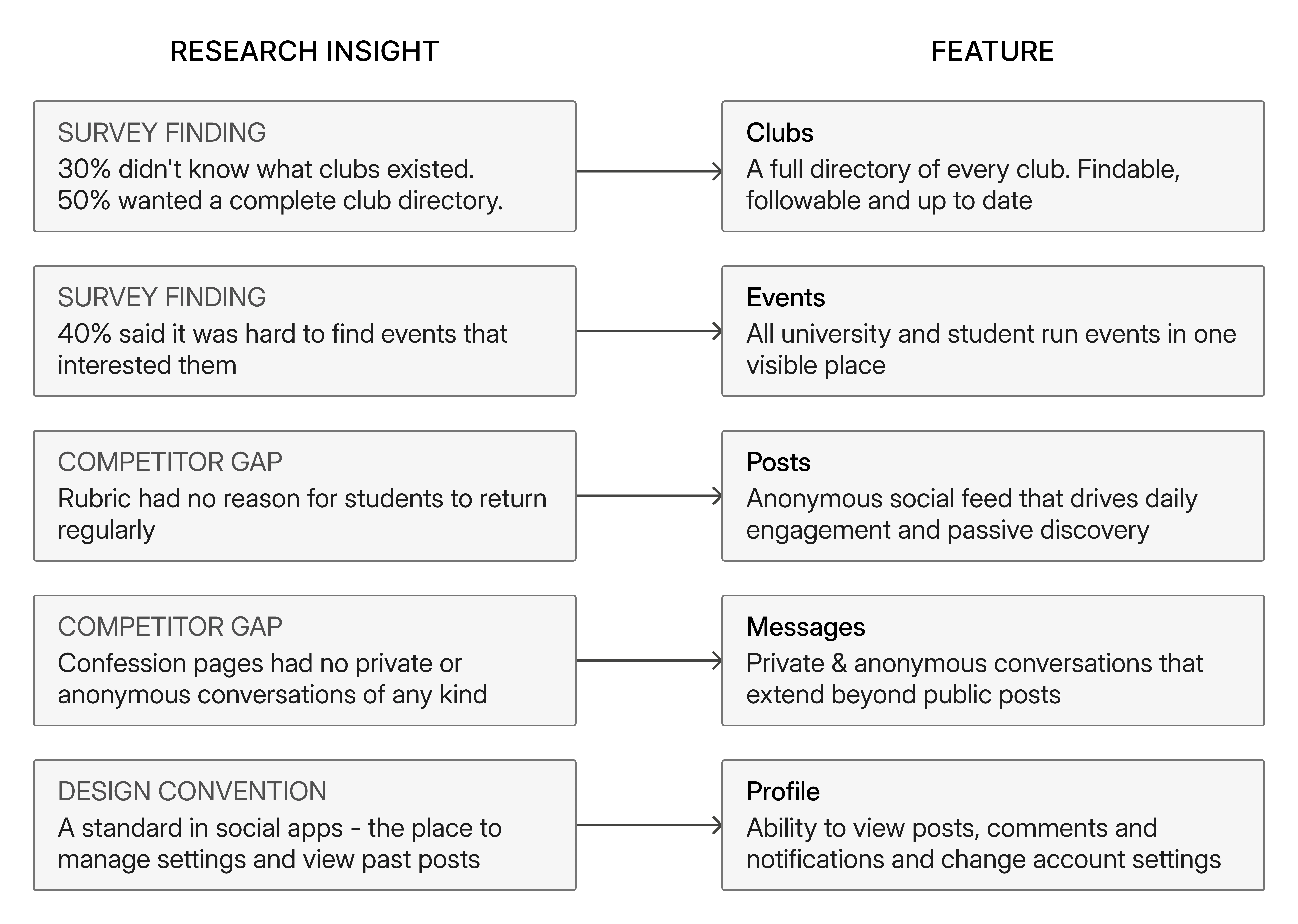 From those gaps, I developed two core principles: anonymous engagement, and events for students, by students. Students weren't just passive consumers — they wanted to organise things themselves, not just attend whatever the university put on. From there, the five core features mapped out naturally.