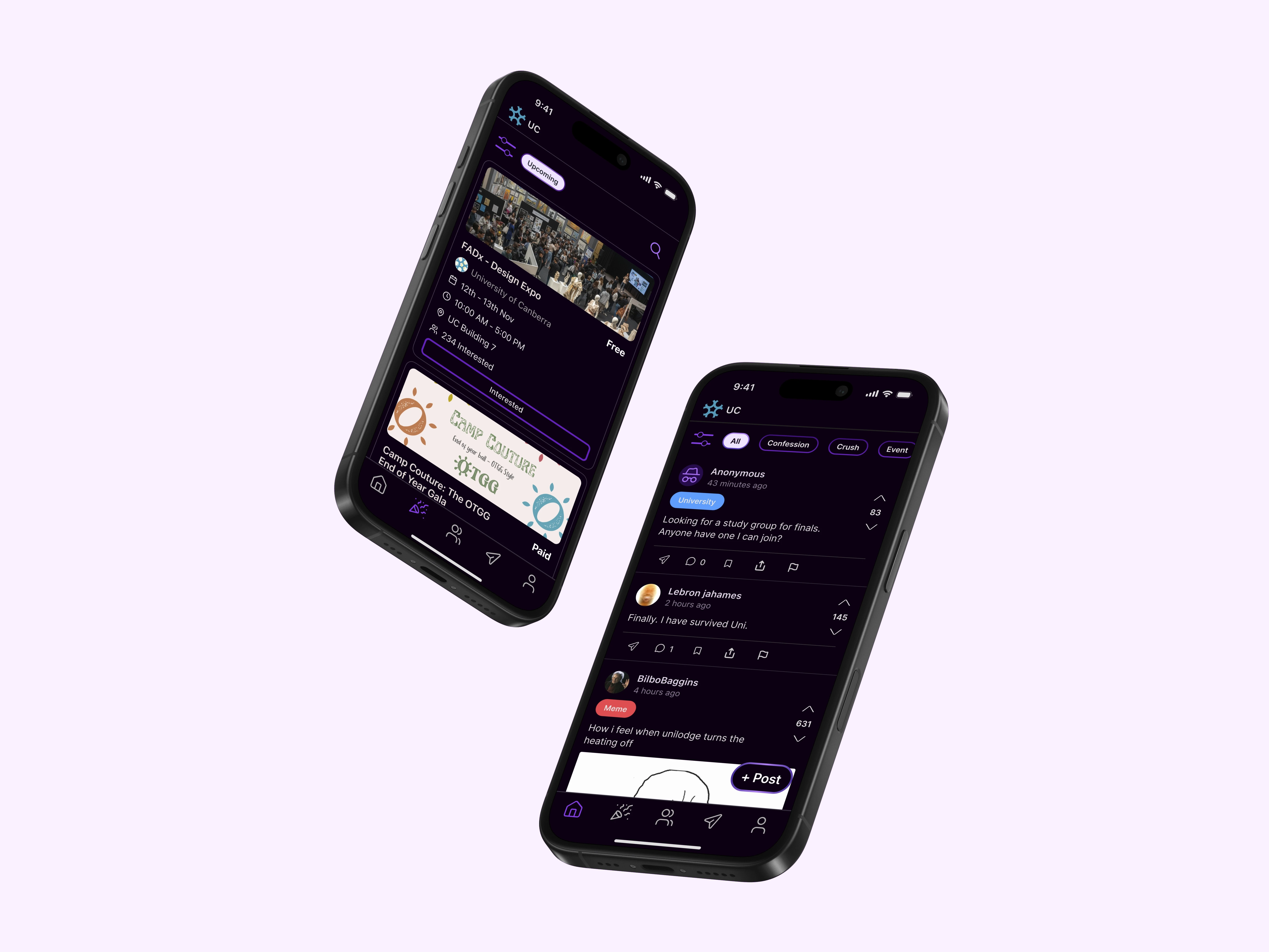 Posts — The social and engagement layer. Memes, uni life, questions, informal events. It's what keeps people coming back and makes discovery feel natural rather than forced.